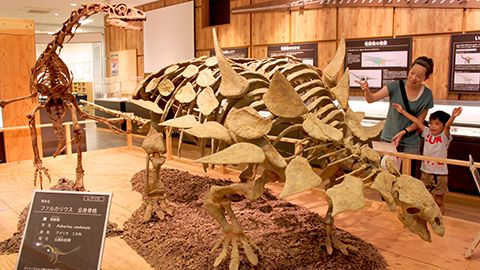 国内で展示される機会が非常に少ないガストニア(鎧竜類)の全身骨格レプリカを常設展示(写真右)。 写真左のファルカリウス(テリジノサウルス類)同様、丹波でも発見されている。 至近距離で見学でき、迫力満点だ。