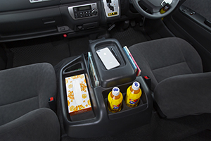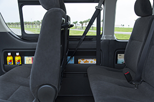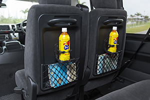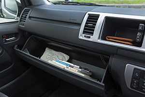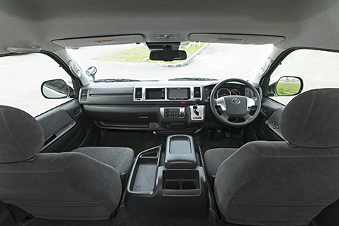 HIACE GRAND CABIN is like a truck where the engine is located under the driver's seat. Therefore the height from the ground to driver's seat is high and the visibility is good. In addition, because of the sliding door, you do not have to worry about accidentally hitting the wall or the next car when parking.